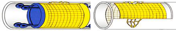 - Positionieren des Packers an der Schadstelle mit TV- Technik, - Der Gewebeschlauch wird mit steuerbarem Druck an die Wandung des defekten Rohres gepresst. Nach kurzer Aushärtzeit des Kunstharzes entsteht ein statisch selbsttragendes System. Der Sanierungspacker wird entfernt und die „ Schadstelle „ nochmals mit TV inspiziert. |